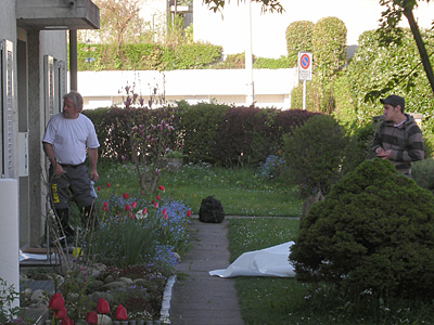 gaertner jetzt sind die gärtner an der arbeit. die alten wiesen und beete werden erneuert und auch alle wege.