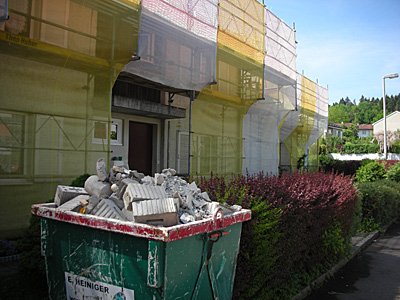 die baustelle läuft, auf dem dach wird gehämmert und gesägt, im keller werden leitungen verlegt und die wände gedämmt. handwerker gehen ein und aus, es ist zeitweise wie in einem ameisenhaufen.