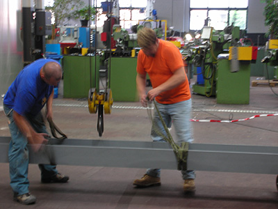 die stahlbauer schleppen die grossen träger in die halle, wo sie mit dem kran hochgezogen werden und dann die anschlüsse verschraubt oder verschweisst werden.