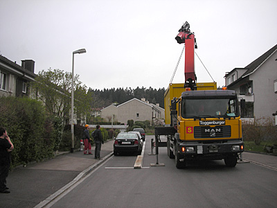 heute gehts los! der pneukran wurde gestern in position gebracht und steht bereit. die zimmerleute sind auf der baustelle und bereiten im scheinwerferlicht alles vor.