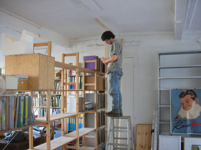 1ogim büro im 1. stock wird eine neue trennwand eingezogen, um die beiden bereiche zu trennen. felix ist an der arbeit.